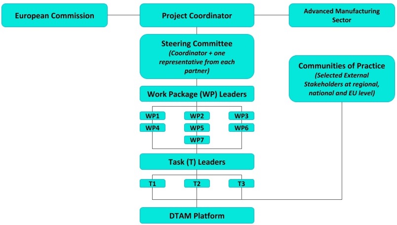 Work Packages and tasks have been designed given the expertise and talents of each partner or sectoral representative. The H/VET and training center staff offer expertise on pedagogical design, and are the main developers of WP2 while relevant Applied Information and Communication Technology representatives offers key input for the development of IoT solutions (WP4). HE and VET Centers will collaborate with the sectoral representatives, each with their specific technical experience to design the best training materials for the development of digital transformation competence for OT/IT EQF level 4-5+ technicians. AM sectoral partner AFM and associated partners, with their network, have contributed specifically to the design of WP2. A Digital Transformation Skills Index – around which the whole DTAM curriculum has been built, has also be mentored and has validated the completed curriculum.